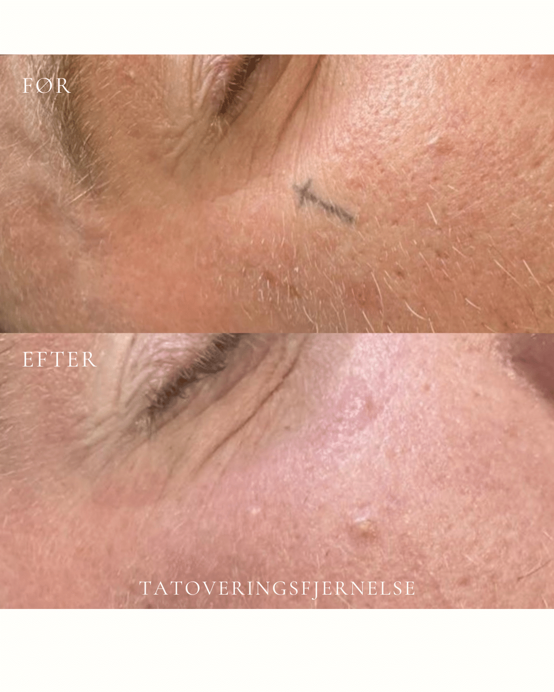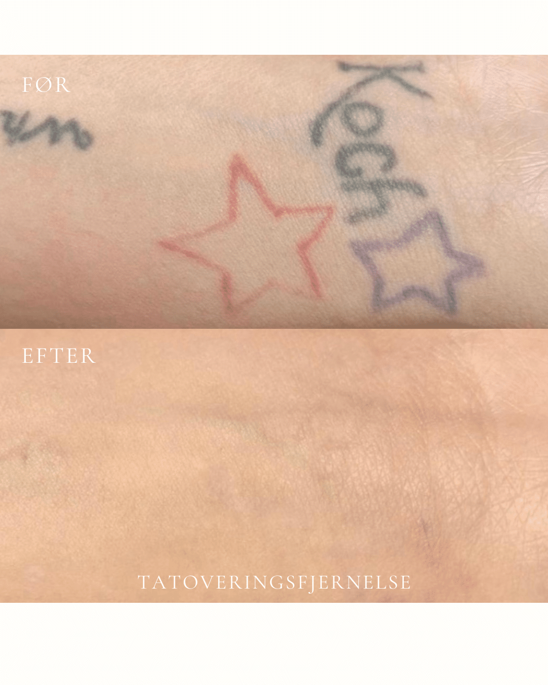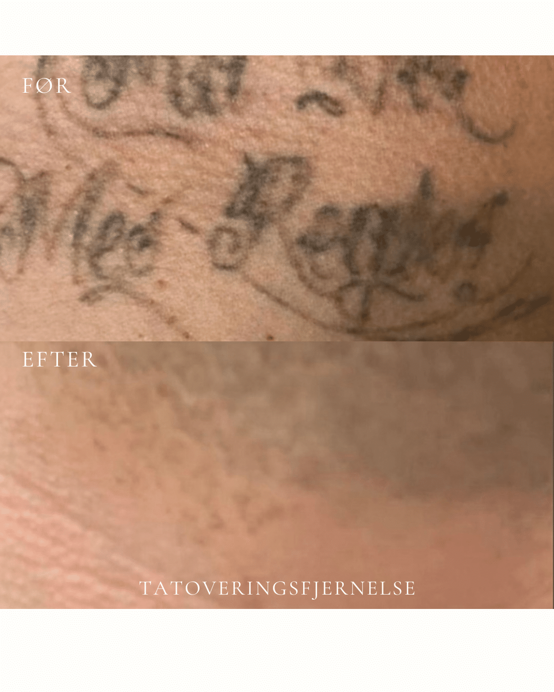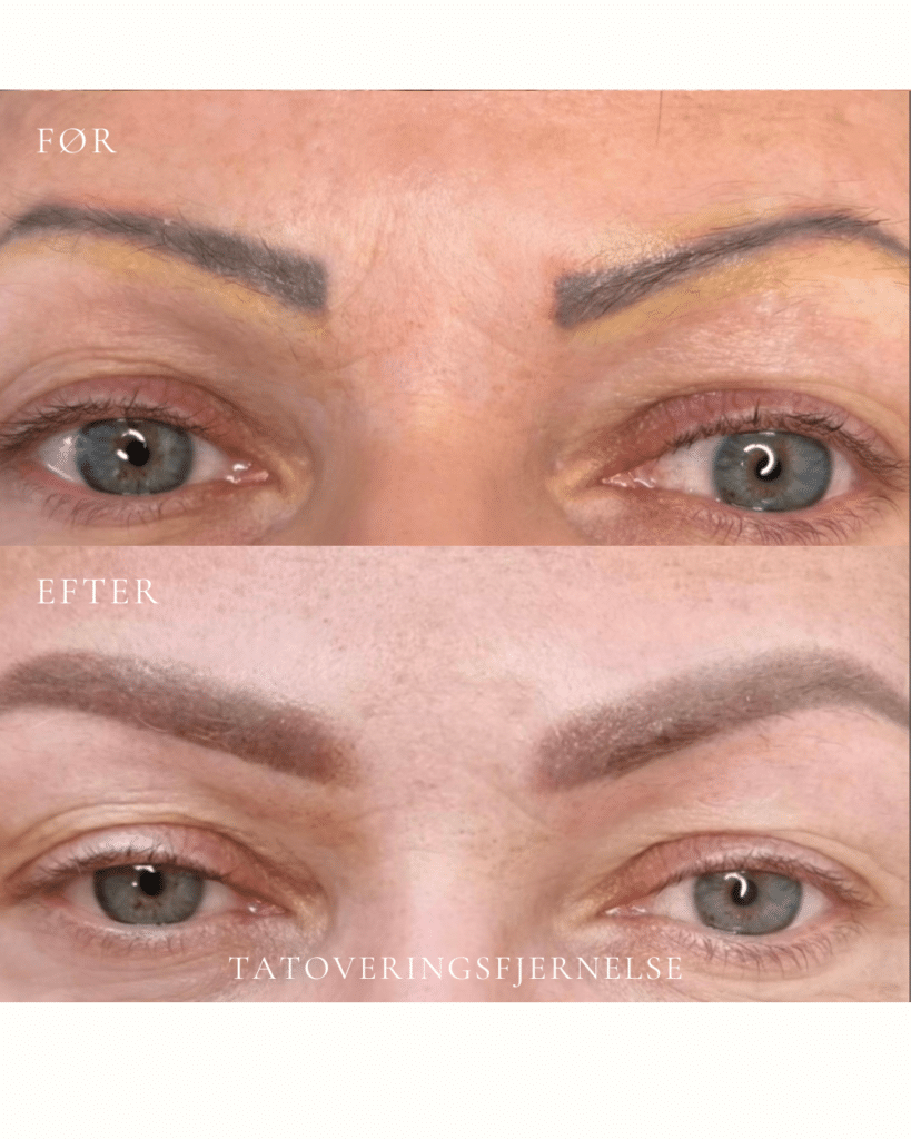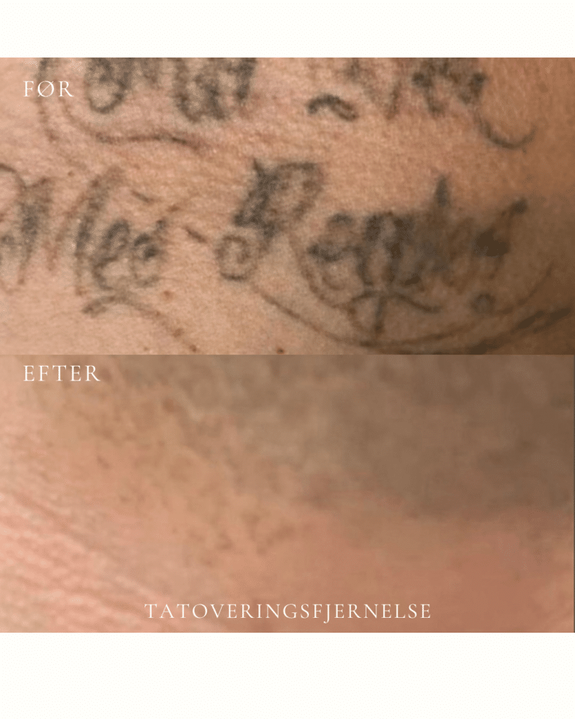 Resultatet varierer fra tatovering til tatovering. Faktorer som farve, dybde, størrelse, placering, alder på tatoveringen samt din hudtype har alle betydning for, hvor hurtigt og effektivt pigmentet kan nedbrydes. De fleste tatoveringer kræver 6–10 behandlinger, men antallet kan variere betydeligt afhængigt af den enkelte tatovering. Dette vurderes individuelt ved din forundersøgelse. Målet er en gradvis og kontrolleret nedbrydning af pigmentet, så huden efterlades så ensartet og naturlig som muligt.